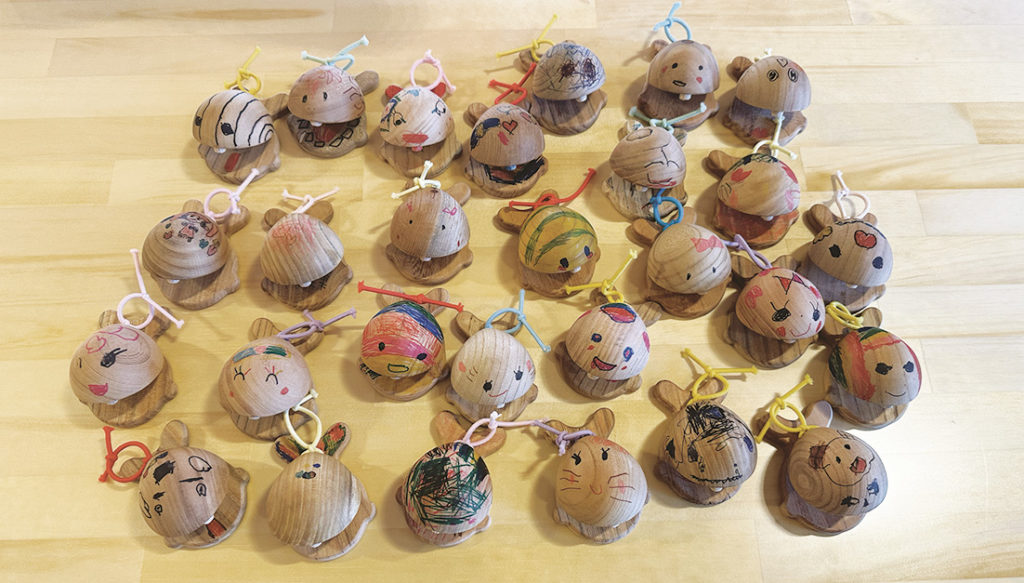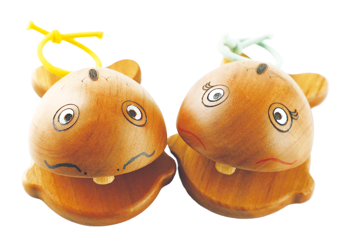 下記は販売用の「かぷたねっと」ですが、ワークショップでは無地の状態にペンで絵付けし、オリジナルのカスタネットの完成です!(他の動物でもいいよ!)